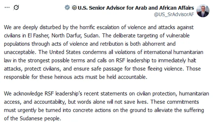 وأضاف "بولس"، عبر منصة إكس، أنَّ الولايات المتحدة تشعر بقلق بالغ إزاء التصعيد المروِّع للعنف والهجمات ضد المدنيين في الفاشر، مشددًا على أن "الاستهداف المتعمد للسكان المستضعفين من خلال أعمال العنف والانتقام أمرٌ مقيت وغير مقبول".