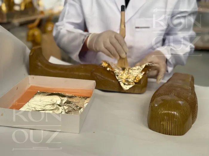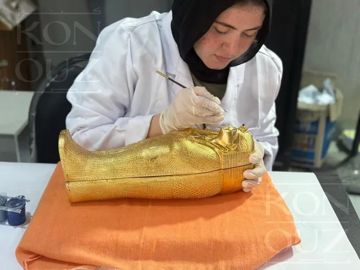 تم تنفيذ الدعوة بأيادٍ مصرية خالصة عبر شركة كنوز مصر للنماذج الأثرية، تحت إشراف المجلس الأعلى للآثار، كل تفصيلة فيها تحكي قصة من العناية والاتقان من قسم النحت الذي صاغ الزخارف والرموز والكتابات الهيروغليفية بدقة تحاكي الأصل، مرورًا بعمليات الاستنساخ، ثم التذهيب والتلوين، وصولًا إلى لمسة المخمل الفاخر الذي يُغلف الداخل، لتظهر في صورتها النهائية التي تليق بعظمة الاحتفالية ومكانة المتحف، وكأنك أمام نسخة مصغرة من تابوت توت عنخ آمون ذاته.