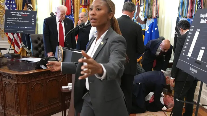 انهار الرجل، خلف ترامب خلال مؤتمر صحفي في المكتب البيضاوي مع شركات الأدوية لتوسيع نطاق التغطية وخفض أسعار أدوية السمنة.