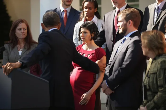 وكانت أليسون تُكافح للبقاء واقفة على قدميها، بينما يُرى أوباما وهو يُمسك بيدها قائلًا: "أنا أساندك، أنتِ بخير"، ثم مازحها قائلًا: "هذا يحدث عندما أتحدث طويلاً".