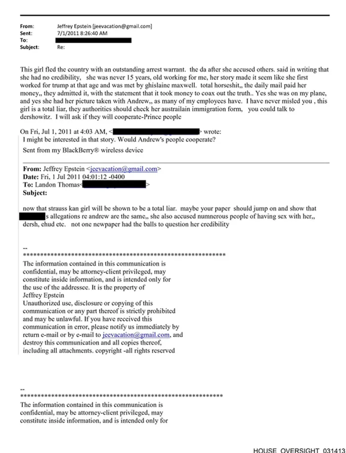وظهر البريد الإلكتروني بعد وقت قصير من الكشف عن هوية الفتاة في صحيفة بريطانية، التي نشرت أيضًا صورة لها مع أندرو وجيسلين ماكسويل، شريكة إبستين.