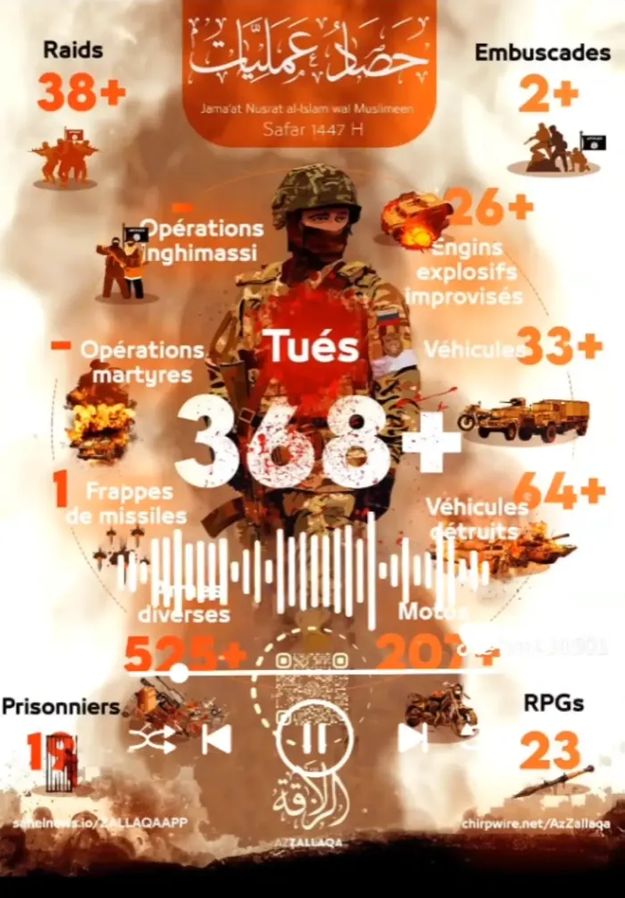 وفي الأسابيع الأخيرة، حاصرت الجماعة التابعة لتنظيم القاعدة العاصمة المالية باماكو، مستهدفةً قوافل الوقود وخطوط الإمداد الحيوية.