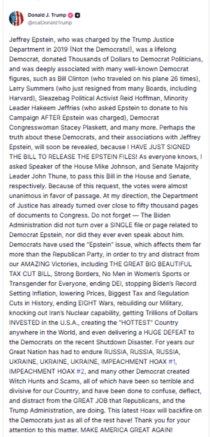 واختتم ترامب منشوره قائلًا: "ربما سيتم الكشف قريبًا عن حقيقة هؤلاء الديمقراطيين وارتباطاتهم بجيفري إبستين، لأنني وقّعت للتو على مشروع قانون لإصدار ملفات إبستين!".