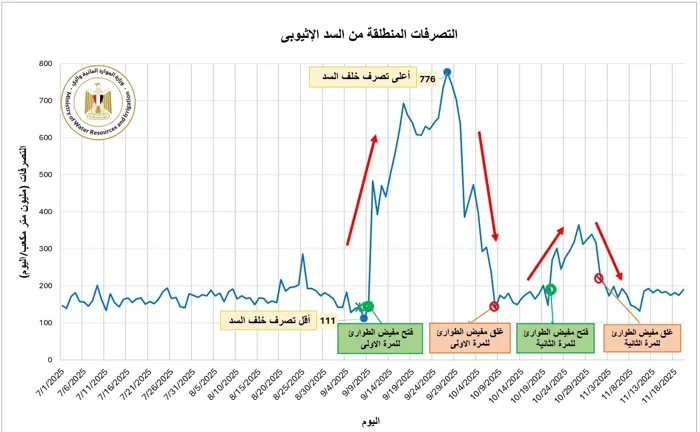 وأكدت الوزارة أنه تم إغلاق مفيض الطوارئ للمرة الثانية يوم 31 أكتوبر الماضي، وبلغ متوسط المنصرف خلال الفترة من 1 إلى 20 نوفمبر 2025 نحو 180 مليون م3 يوميًا، بزيادة تقارب 80% عن المتوسط التاريخي للفترة نفسها، والبالغ نحو 100 مليون م3 يوميًا، وهو ما يؤكد استمرار التقلبات الحادة في التصرفات المائية على مجرى النيل الأزرق.