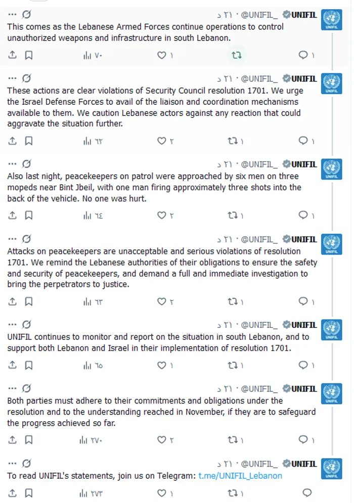 وتواصل "يونيفيل" مراقبة الوضع في جنوب لبنان والإبلاغ عنه، ودعم كل من لبنان وإسرائيل في تنفيذهما للقرار 1701، فيما شددت على أنه يجب على كلا الطرفين التقيّد بالتزاماتهما بموجب القرار والتفاهم الذي تم التوصّل إليه في نوفمبر، إذا أرادا الحفاظ على التقدّم المحرز حتى الآن.