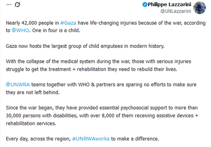 حذَّر وكيل الأمين العام للأمم المتحدة والمفوض العام لوكالة الأمم المتحدة لإغاثة وتشغيل لاجئي فلسطين "أونروا" من الوضع الإنساني الكارثي في قطاع غزة، مؤكدًا أن القطاع يضم الآن أكبر عدد من الأطفال مبتوري الأطراف في التاريخ الحديث، نتيجة للعمليات الحربية المستمرة.