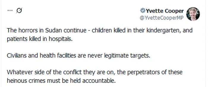 دعت وزيرة الخارجية البريطانية، إيفيت كوبر، اليوم الثلاثاء، إلى محاسبة فورية لمرتكبي "الجرائم الشنيعة" في السودان، مشددة على أن استهداف المدنيين والمرافق الصحية أمر غير مقبول إطلاقًا.