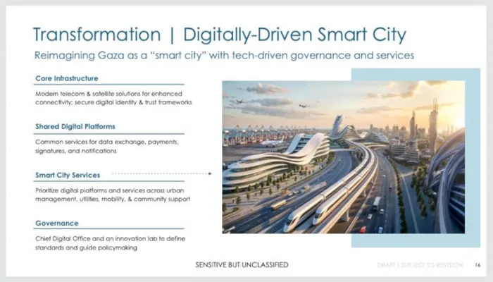 تحدد الوثيقة المصنفة بـ"حساسة لكن غير سرية" خطوات تفصيلية لنقل سكان غزة البالغ عددهم نحو مليوني نسمة من الخيام والفقر المدقع إلى شقق فاخرة وحياة مزدهرة، إلا أن المسودة أغفلت تفاصيل حاسمة، إذ لم تكشف عن الدول أو الشركات المحددة التي ستمول عملية إعادة الإعمار الضخمة، كما لم تحدد بدقة المواقع التي سيعيش فيها الفلسطينيون النازحون خلال فترة البناء والتطوير.