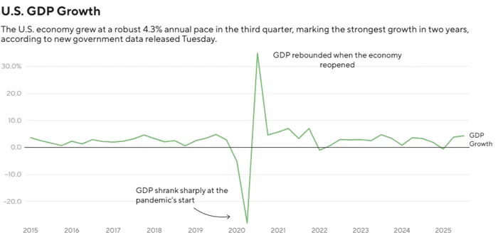 وأكدت وزارة التجارة الأمريكية، أن الاقتصاد الأمريكي نما بمعدل سنوي قدره 4.3% في الربع الثالث، وفقًا للتقديرات الأولية للحكومة، وبحسب شبكة "إيه بي سي" الأمريكية، يُمثل ذلك تسارعًا من نمو بنسبة 3.8% تم تسجيله في الربع السابق من عام 2025.