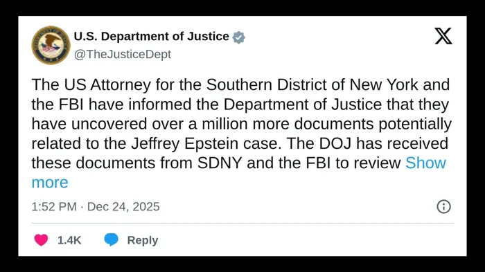ويأتي الإعلان المذهل عن مجموعة جديدة من الوثائق -في منتصف فترة ما بعد الظهر عشية عيد الميلاد بالتوقيت الشرقي للولايات المتحدة- في الوقت الذي تواصل وزارة العدل نشر آلاف الوثائق المتعلقة بإبستين، والتي غالبًا ما تكون منقحة بشكل كبير، وبعضها يتعلق بالرئيس دونالد ترامب.