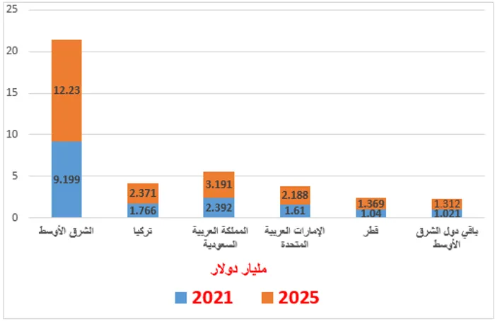وفي هذا الإطار قُدر حجم سوق الخدمات العقارية العالمية نحو 100.25 مليار دولار، حيث استحوذت منطقة الشرق الأوسط وإفريقيا على الحصة الأكبر من السوق بنحو 2% من الإيرادات العالمية، فكما يوضح الشكل (1) ارتفعت هذه الإيرادات من نحو 9.199 مليار دولار في عام 2021 إلى نحو 12.23 مليار دولار في عام 2025.