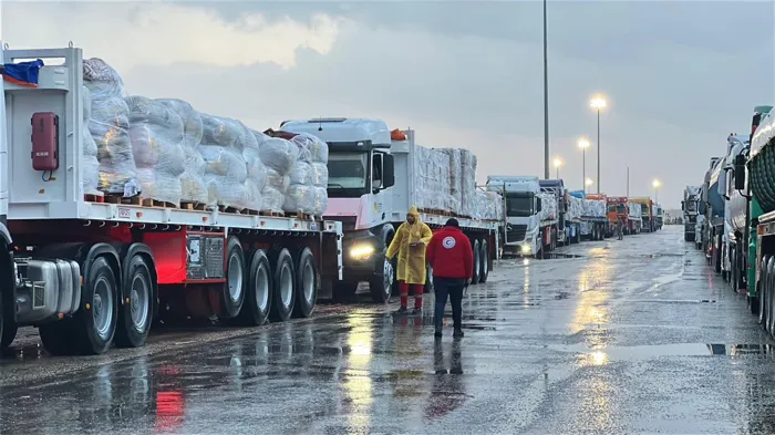 أطلق الهلال الأحمر المصري، اليوم الأحد، وسط موجة شديدة من الأمطار قافلة "زاد العزة.. من مصر إلى غزة" رقم 103، حاملة عددًا من شاحنات المساعدات الإنسانية العاجلة في اتجاه قطاع غزة، في إطار جهوده المتواصلة كآلية وطنية لتنسيق المساعدات إلى غزة.