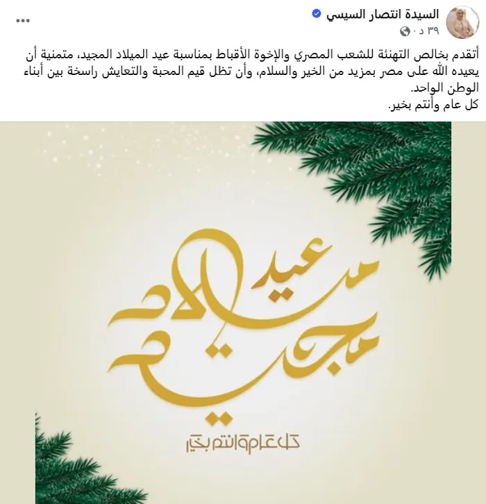 وقالت السيدة انتصار السيسي، في تدوينة عبر حسابها على موقع "فيسبوك": "أتقدم بخالص التهنئة للشعب المصري والإخوة الأقباط بمناسبة عيد الميلاد المجيد، متمنية أن يعيده الله على مصر بمزيد من الخير والسلام، وأن تظل قيم المحبة والتعايش راسخة بين أبناء الوطن الواحد. كل عام وأنتم بخير".
