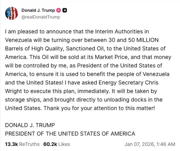 بعد أن أعلن الرئيس الأمريكي دونالد ترامب عبر منصته الاجتماعية Truth Social أن الولايات المتحدة ستتلقى ما يصل إلى 50 مليون برميل من النفط الخاضع للعقوبات من فنزويلا، بقيمة تقارب 2.5 مليار دولار، أشار تقرير لموقع "أكسيوس" إلى أن "لدى إدارة ترامب هدف بسيط هناك: دعم حكومة موالية للولايات المتحدة، وتزويدها بملايين البراميل من النفط الفنزويلي".