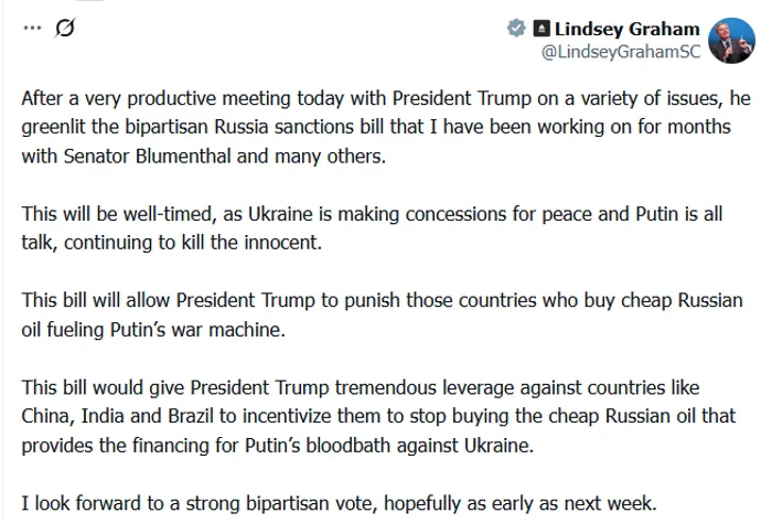 وأشار إلى أنه يتوقع تصويتًا نشطًا من الحزبين على المشروع، مُرجِّحًا أن يتم التصويت في مطلع الأسبوع المقبل، مضيفًا أن مشروع القانون -حال اعتماده- سيمنح ترامب نفوذًا هائلًا على الشركاء التجاريين لروسيا، بما في ذلك الصين والهند والبرازيل، للضغط عليهم من أجل وقف مشترياتهم من النفط الروسي.
