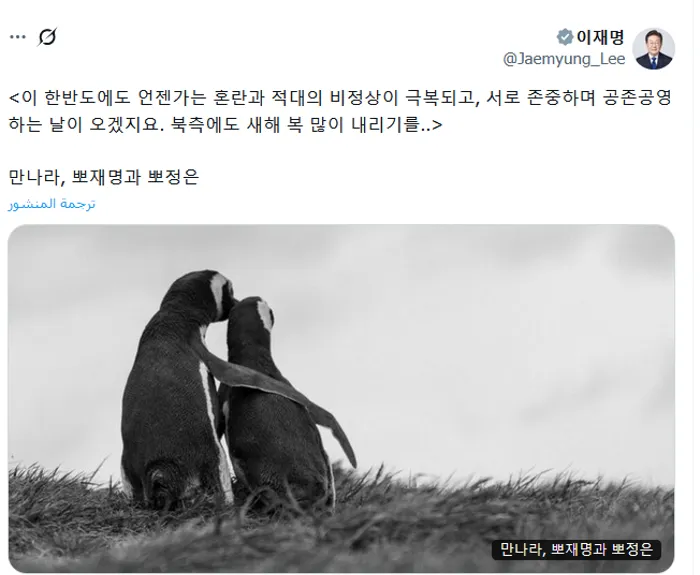 نشر الرئيس الكوري الجنوبي لي جاي ميونج، صورة لبطريقين يتعانقان في رسالة تهنئة بالعام الجديد إلى بيونج يانج، داعيًا الزعيم الكوري الشمالي كيم جونج أون إلى لقائه، حسبما أفادت "فرانس برس".