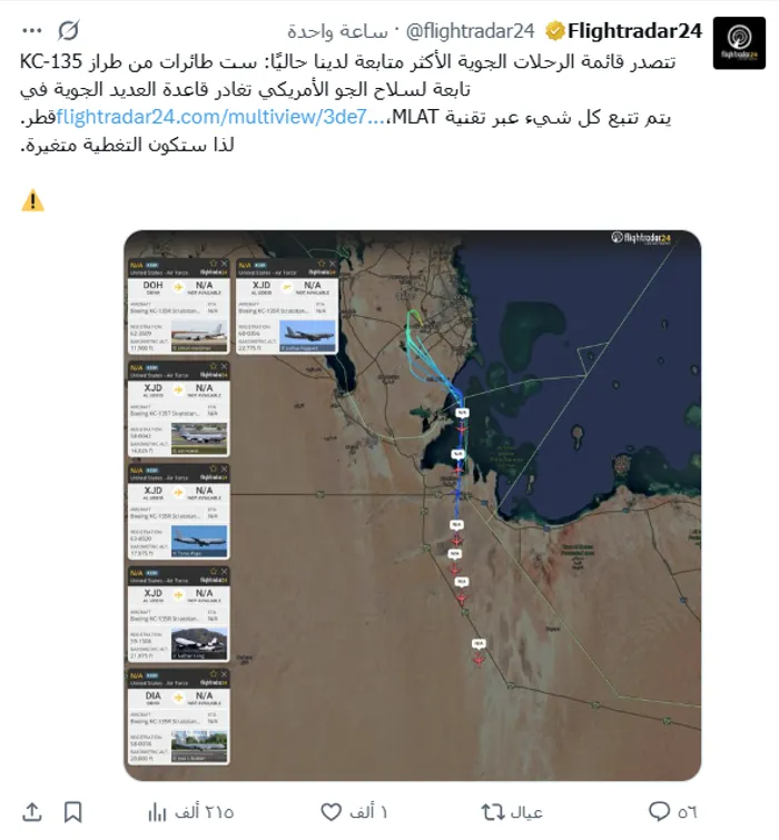 أفادت وسائل إعلام دولية ومواقع متخصصة في تتبع حركة الملاحة الجوية بإقلاع 6 طائرات تزويد بالوقود من طراز "KC-135" تابعة للقوات الجوية الأمريكية من قاعدة "العديد" في قطر إلى وجهة غير معلومة.