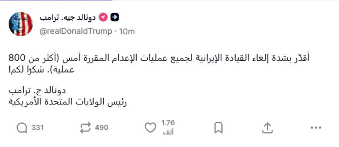 ووجه ترامب في تدوينة نشرها عبر منصة "تروث سوشيال"، شكرًا مباشرًا لطهران، قائلًا: "أُقدِّر كثيرًا حقيقة أن جميع عمليات الإعدام المقررة شنقًا، والتي كان من المفترض أن تُنفَّذ أمس، وتتجاوز 800 عملية، أُلغيَت بقرار من قيادة إيران.. شكراً لكم".