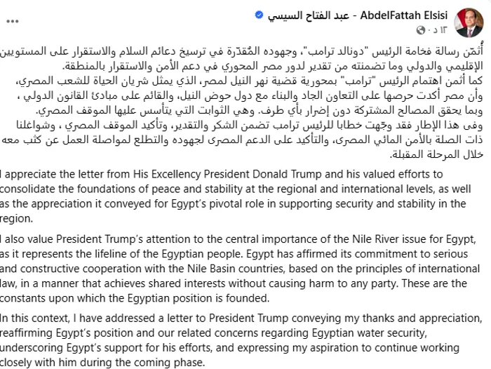 كما ثمَّن الرئيس المصري، في تدوينة على صفحته الرسمية "فيسبوك"، اليوم السبت، اهتمام الرئيس ترامب بمحورية قضية نهر النيل لمصر، الذي يمثل شريان الحياة للشعب المصري.