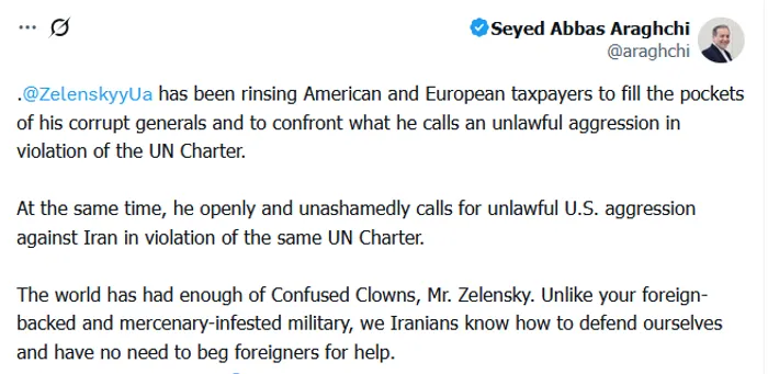 هاجم وزير الخارجية الإيراني، عباس عراقجي، فلاديمير زيلينسكي، معتبرًا أن الجيش الأوكراني يعتمد على الخارج وممتلئ بالمرتزقة، أما إيران فتعرف جيدًا كيفية الدفاع عن نفسها.