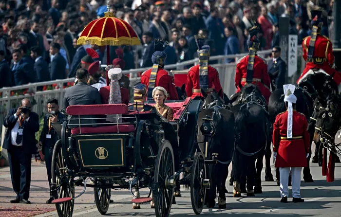وظهرت فون دير لاين مرتدية قميصًا هنديًا تقليديًا بلون ذهبي، في إشارة واضحة لاحترام التراث الهندي، فيما شارك في العرض وفد من الاتحاد الأوروبي يحمل أعلام المفوضية والمجلس الأوروبيين.