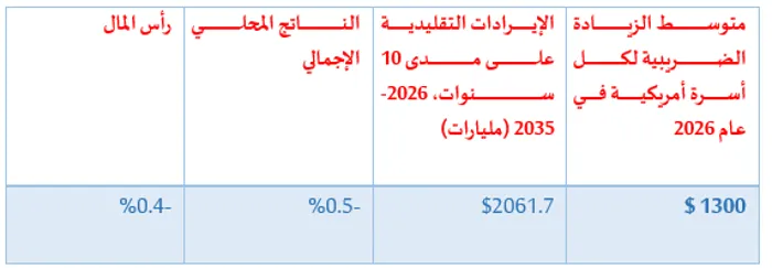 وفقًا للجدول (1)، فإن سياسة الرسوم الجمركية لترامب ستُدر نحو 2.1 تريليون دولار من الإيرادات خلال الفترة من 2026 إلى 2035، وستُخفض الناتج المحلي الإجمالي للولايات المتحدة بنسبة 0.5%، كما ستُخفض نسبة رأس المال بنسبة 0.4%، وذلك قبل احتساب أي إجراءات انتقامية أجنبية، وبالأخذ في الاعتبار الآثار الاقتصادية السلبية، فإن الإيرادات المُحصلة من هذه الرسوم ستنخفض إلى 1.6 تريليون دولار على مدى العقد القادم.