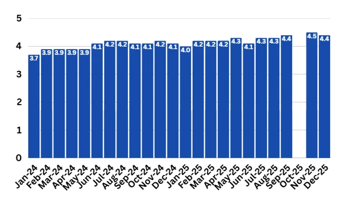 (-) معدل البطالة: يتضح من الشكل (3) أن معدل البطالة في الولايات المتحدة الأمريكية خلال عام 2025 سجل ارتفاعًا عن مستواه في عام 2024، إذ بلغ 4.3% في مايو 2025 بالمقارنة بـ 3.9% في الشهر نفسه من العام السابق، وتذبذب بين الارتفاع والانخفاض حتى بلغ 4.5% في نوفمبر 2025، بالمقارنة بـ 4.2% في نوفمبر 2024، وفي ديسمبر بلغ 4.4% بالمقارنة بـ 4.1% في العام السابق.