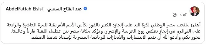 وتابع: "هذا الفوز إنجاز يعكس روح العزيمة والإصرار، ويؤكد مكانة مصر بين عظماء اللعبة قاريًا وعالميًا. فخور بكم، وأدعو الله أن يديم الانتصارات والانجازات للرياضة المصرية لإسعاد شعبنا العظيم".