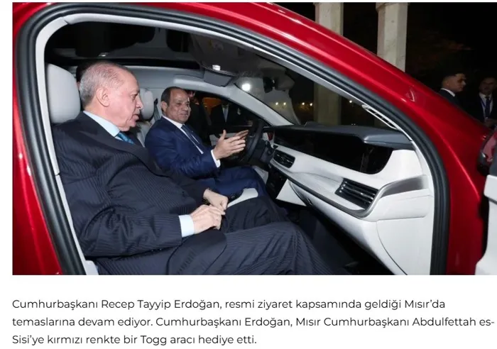 وكانت سيارة "توج" الكهربائية التركية التي أهداها الرئيس التركي رجب طيب أردوغان إلى الرئيس المصري عبد الفتاح السيسي، محط أنظار وسائل الإعلام التركية، وكتبت صحيفة "دنيا"، أنه في حين يواصل أردوغان مهامه في مصر من خلال زيارة رسمية، قدّم الرئيس التركي لنظيره المصري سيارة "توج" حمراء كهدية.