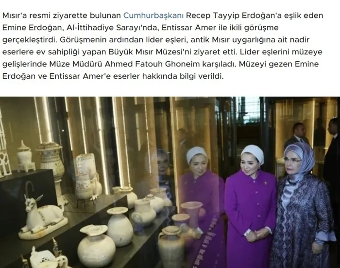واهتمت وسائل الإعلام التركية، بزيارة زوجة الرئيس التركي أمينة أردوغان، للمتحف المصري الكبير والأهرامات، إذ رافقتها قرينة الرئيس المصري السيدة انتصار السيسي، إذ اطلعتا على قطع أثرية نادرة من الحضارة المصرية القديمة، ومن ثم توجهتا إلى أهرامات الجيزة.