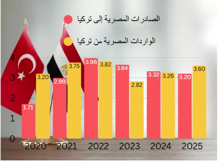 (-) حجم التجارة البينية: أوضح الجهاز المركزي للتعبئة العامة والإحصاء أن حجم التبادل التجاري بين مصر وتركيا بلغ 6.8 مليار دولار خلال عام 2025، بالمقارنة بـ 6.6 مليار دولار خلال عام 2024. وفي الشكل (1)، اتضح أن حجم الصادرات المصرية إلى تركيا ارتفع من 1.71 مليار دولار إلى 3.20 مليار دولار في عام 2025، أي بنسبة 87.1%. كما ارتفعت الواردات المصرية من تركيا من 3.20 مليار دولار في عام 2020 إلى 3.60 مليار دولار في عام 2025، أي بنسبة 12.5%، وهو ما يوضح أن العلاقات التجارية بين مصر وتركيا اتجهت إلى الانتعاش بشكل كبير.