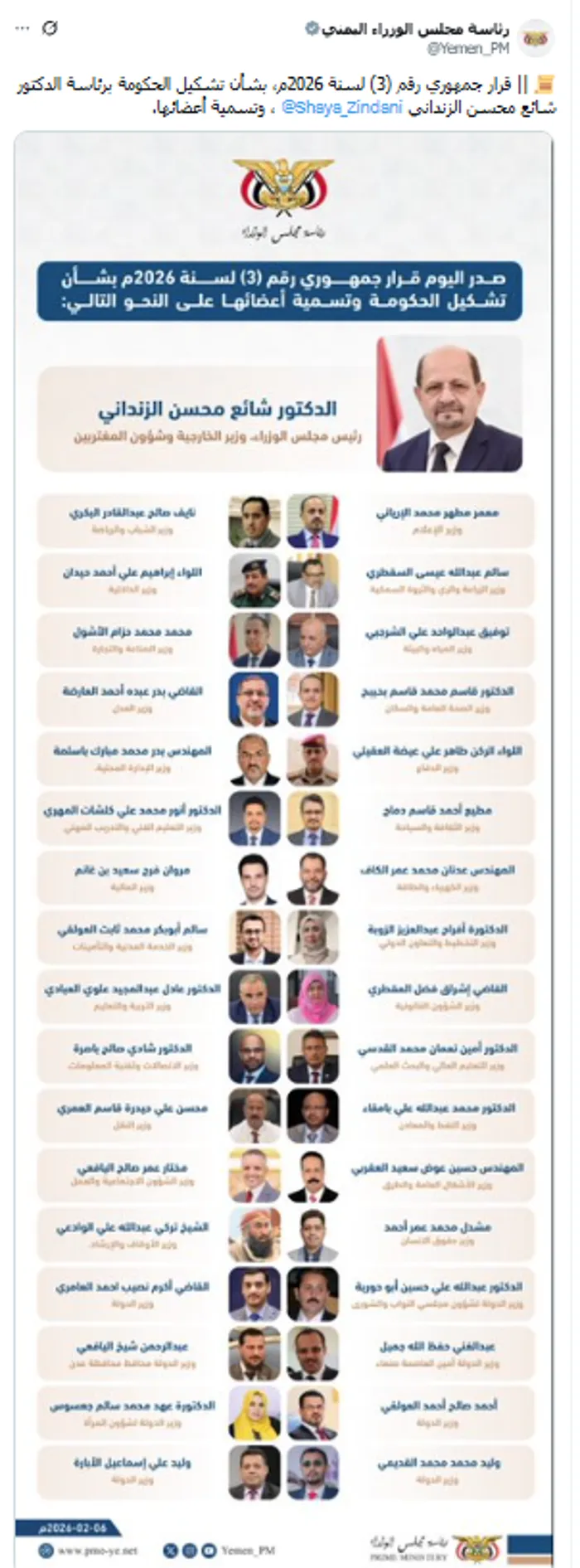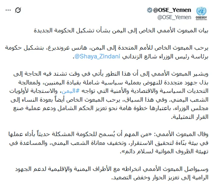 رحّب المبعوث الأممي الخاص إلى اليمن، هانس جروندبرج بتشكيل الحكومة اليمنية الجديدة برئاسة شائع الزنداني، مُشددًا على دعمه الجهود الرامية إلى تعزيز الحوار بين اليمنيين وخفض التصعيد.