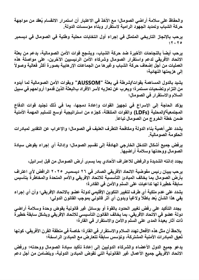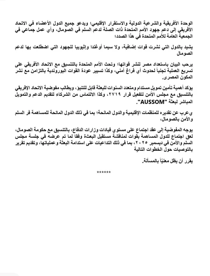 ورحب البيان بالاستعداد الذي أيدته مصر لنشر قواتها ضمن بعثة الاتحاد الإفريقي الجديدة لدعم وتحقيق الاستقرار في الصومال (AUSSOM)، مشددًا على ضرورة تسريع عمليات دمج القوات المحلية لضمان تسليم المهام الأمنية بنجاح.