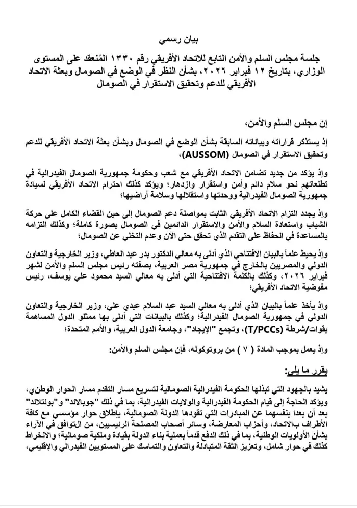 كما أشاد المجلس بالنجاحات الميدانية للجيش الصومالي ضد حركة "الشباب" الإرهابية، داعيًا إلى توفير تمويل مستدام ومتعدد السنوات للبعثة الأفريقية لضمان استمرارية عملياتها. وفي الشأن الداخلي، حث المجلس الحكومة الفيدرالية والولايات الصومالية على تعزيز الحوار الوطني الشامل لتسريع مسار بناء الدولة.