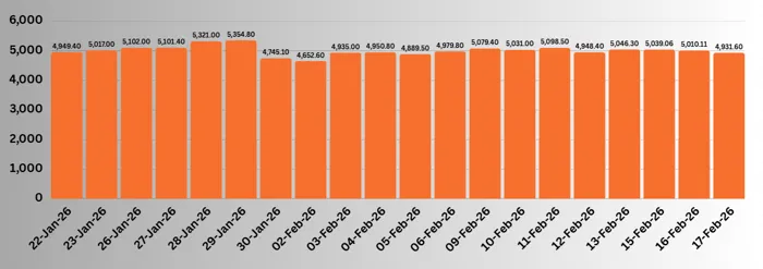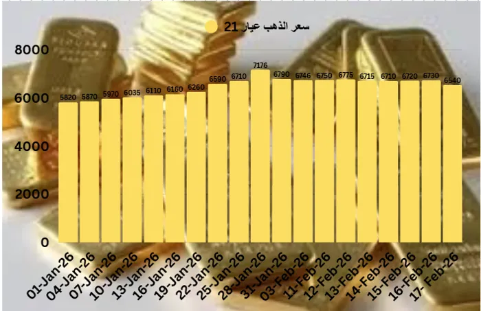(*) سعر الأونصة عالميًا: يؤثر سعر الأونصة بشكل كبير على سعر الذهب في الأسواق المحلية، فإذا ارتفع أو انخفض سعر أونصة الذهب، من المتوقع أن تشهد الأسواق المحلية نفس المسار، وإن كان بمعدلات مختلفة، ويوضح الشكل (2) تذبذب سعر الأونصة خلال الفترة التي يُحددها الشكل، إذ ارتفعت من 4949.4 دولار في 22 يناير 2026 إلى 5354.8 دولار في 28 يناير 2026، ثم انخفضت إلى قيم تتراوح من 4745.10 دولار إلى 4979.8 دولار، ثم شهدت ارتفاعًا طفيفًا فوق الـ 5000 دولار للأونصة خلال الفترة من 9 فبراير 2026 إلى 16 فبراير 2026، تخللها أيضًا انخفاضات طفيفة، حتى بلغت نحو 4931.60 دولار في 17 فبراير 2026.