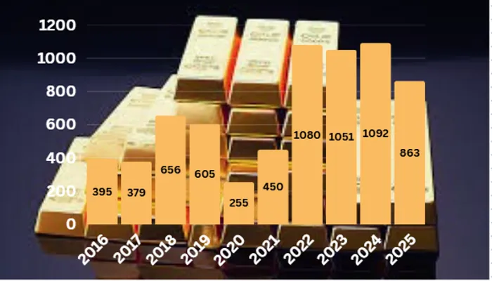 (*) مشتريات البنوك المركزية من الذهب: تُعد مشتريات الذهب من قِبل البنوك المركزية مُحدِدًا رئيسيًا لاتجاهات سعره، فقد واصلت البنوك المركزية زيادة حيازتها من الذهب خلال عام 2025، ولكن بقدر أقل من عام 2024، وتُشير تقديرات مجلس الذهب العالمي إلى زيادة بمقدار 863 طنًا خلال العام، بالمقارنة بـ 1092 طنًا في عام 2024، ولكن سيستمر زخم الشراء في عام 2026، فقد رفع البنك الصيني إجمالي الاحتياطيات من الذهب إلى نحو 74.19 مليون أونصة بنهاية شهر يناير 2026، بزيادة تُقارب 40 ألف أونصة عن ديسمبر 2025.