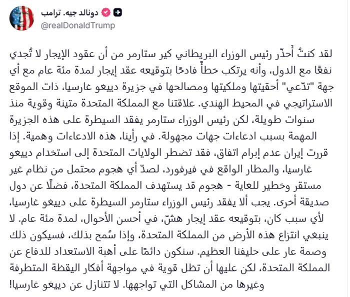 وجّه الرئيس الأمريكي دونالد ترامب تحذير شديد اللهجة إلى رئيس الوزراء البريطاني كير ستارمر، مطالبًا إياه بالتراجع عن اتفاق التخلي عن جزر "تشاجوس" في المحيط الهندي، مؤكدًا أن قاعدة "دييجو جارسيا" العسكرية تمثّل ركيزة استراتيجية لا غنى عنها لصد أي هجوم محتمل من النظام الإيراني.