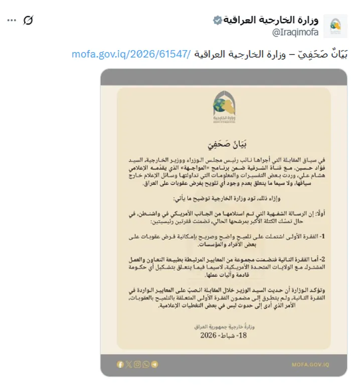 وذكرت الوزارة أن الفقرة الثانية تضمنت مجموعة من المعايير المرتبطة بطبيعة التعاون والعمل المشترك مع الولايات المتحدة الأمريكية، لا سيّما فيما يتعلق بتشكيل أي حكومة قادمة وآليات عملها، ولم يتطرق لمضمون التلميح بالعقوبات، ما أدى لتداول معلومات خارج سياقها في بعض وسائل الإعلام.