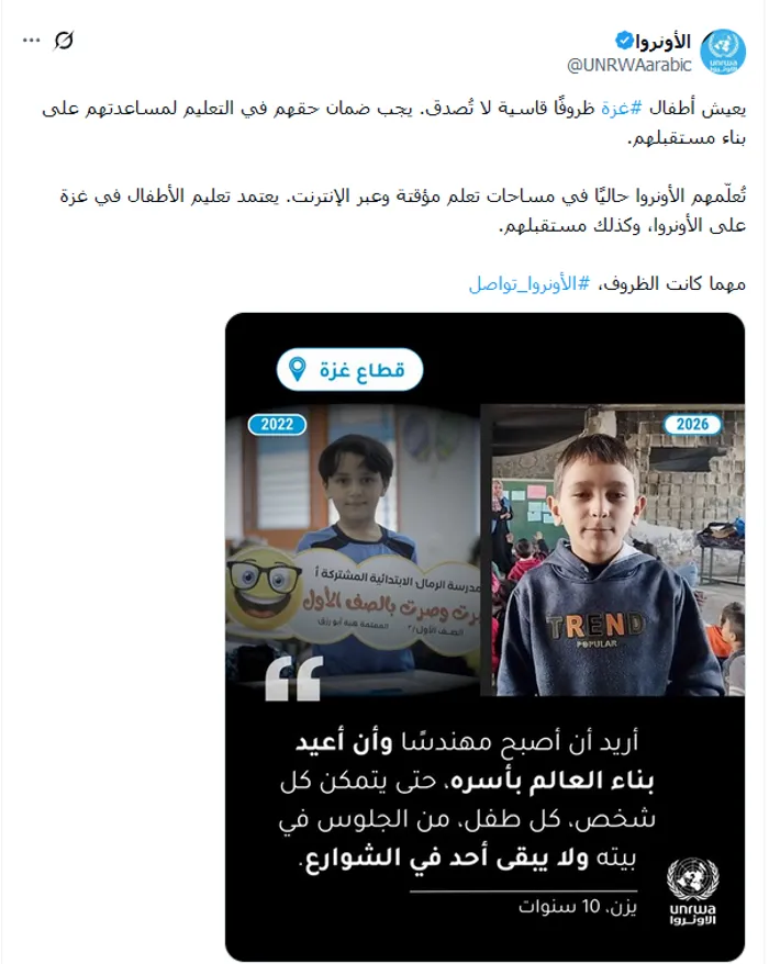 وشددت الوكالة الأممية، في بيانها على منصة "إكس"، اليوم الجمعة، على أن ضمان حقهم في التعليم ليس مجرد خيار، بل ضرورة قصوى؛ لمساعدتهم على تجاوز مآسي الحرب وبناء مستقبلهم.