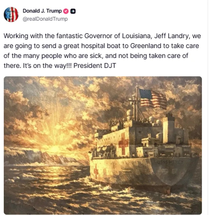 وفي منشور له عبر منصة "تروث سوشيال"، اليوم الأحد، قال ترامب: "بالتعاون مع حاكم ولاية لويزيانا الرائع، جيف لاندري، سنرسل سفينة مستشفى رائعة إلى جرينلاند لرعاية المرضى الكثيرين هناك الذين لا يتلقون الرعاية اللازمة، إنها في الطريق للجزيرة!".