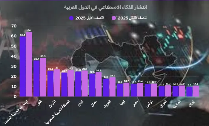 ففي الإمارات العربية المتحدة، ارتفع استخدام السكان للذكاء الاصطناعي من 59.4% إلى 64%، وفي قطر ارتفع من 35.7% إلى 38.3%، وفي الأردن ارتفع من 25.4% إلى 27%، بينما في المملكة العربية السعودية ارتفع من 23.7% إلى 26.2%، وفي لبنان ارتفع من 24.8% إلى 25.7%، وفي عُمان من 22.6% إلى 24.2%.