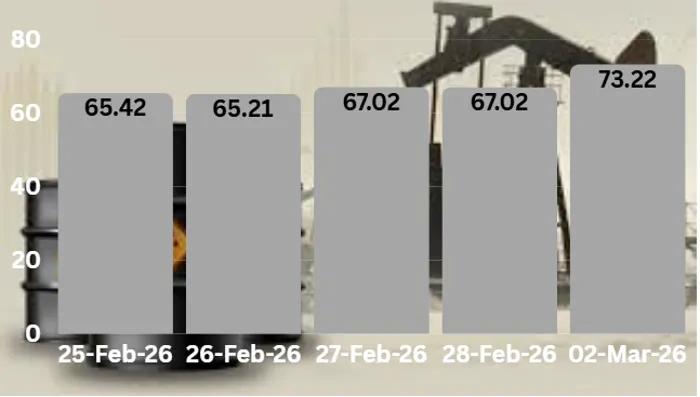 (-) ارتفاع أسعار النفط: يُعتبر هذا المؤشر من أهم المؤشرات التي تؤثر عليها الأحداث الحالية في الشرق الأوسط، إذ إنه عصب الاقتصاديات ومحرك نموها، ويوضح الشكل (1) كيف أثرت الأحداث الحالية في منطقة الشرق الأوسط على أسعار النفط، إذ ارتفعت من 65.42 دولار للبرميل في 25 فبراير 2026 (قبل الهجوم الأمريكي الإسرائيلي على إيران) إلى 73.22 دولار للبرميل في 2 مارس 2026، أي ارتفعت بنسبة 11.9%، هذا بالإضافة إلى أن العقود الآجلة لخام برنت قفزت بنحو 8% قرب مستوى 79 دولارًا للبرميل، بينما صعدت العقود الآجلة للخام الأمريكي 7.6% إلى 72.10 دولار للبرميل.