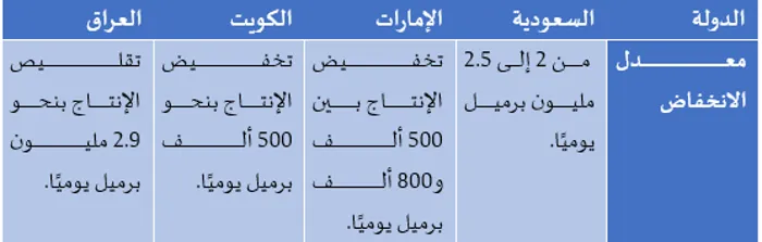 (-) خفض إنتاج النفط: أثرت توترات منطقة الشرق الأوسط على أرباح الشركات المُنتجة للنفط في المنطقة، وهو الأمر الذي ترتب عليه أن أعلنت 4 دول رئيسية منتجة للنفط عن تخفيضات كبيرة في الإنتاج، حيث خفضت السعودية والإمارات والعراق والكويت إنتاجها النفطي مجتمعة بما يصل إلى 6.7 مليون برميل يوميًا، بالشكل الذي يوضحه الجدول (1)، وهو الأمر الذي يُعَدُّ تعديلًا جوهريًا في إمداد النفط العالمية من بعض أكثر الدول تأثيرًا في تصدير النفط.