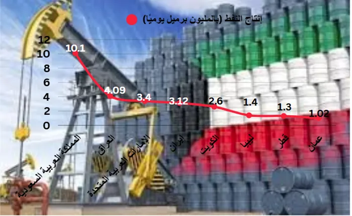 فكما يوضح الشكل (2) أن دول المنطقة تُعَدُّ من الفاعلين الرئيسيين في سوق النفط العالمية، إذ إن المملكة العربية السعودية تُساهم بنحو 10.1 مليون برميل يوميًا، يليها العراق بنحو 4.09 مليون برميل يوميًا، ثم الإمارات بنمو 3.4 مليون برميل يوميًا، ثم إيران بنحو 3.12 مليون برميل يوميًا، تليها الكويت بنحو 2.6 مليون برميل يوميًا، ثم ليبيا بنحو 2.4 مليار برميل يوميًا، وأخيرًا قطر وعُمان، بنحو 1.3 و1.02 مليون برميل يوميًا على التوالي، وبالتالي مع اتخاذ أي قرار لخفض الإنتاج ستتأثر الإمدادات العالمية من هذا الخام.