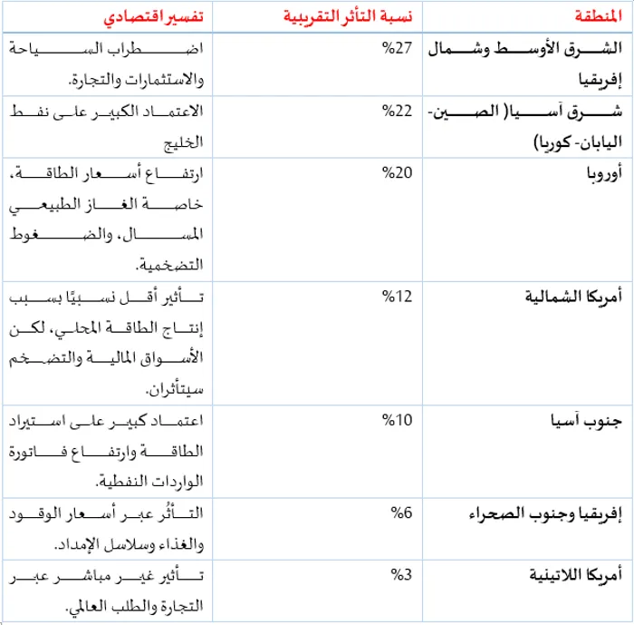 (*) إفريقيا وجنوب الصحراء (6%): يأتي التأثير في هذه المنطقة بشكل غير مباشر عبر ارتفاع أسعار الوقود والسلع الأساسية؛ نتيجة زيادة تكاليف النقل والطاقة عالميًا. كما قد تتأثر الاقتصادات الهشة في دول مثل نيجريا وكينيا بتقلُّبات أسعار الغذاء والطاقة، ما قد ينعكس على مستويات التضخم والاستقرار الاقتصادي.