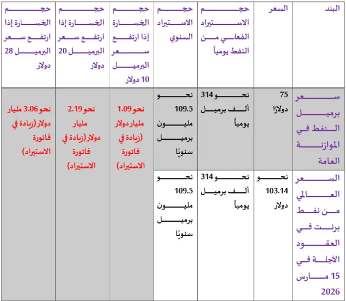 ومع ارتفاع سعر برميل النفط بخلاف السعر المُقدر في الموازنة العامة "75 دولارًا للبرميل" بنحو 10 دولارات، ترتفع فاتورة استيراد النفط بنحو 1.09 مليار دولار، بينما إذا ارتفعت بنحو 20 دولارًا ترتفع فاتورة الواردات بنحو 2.19 مليار دولار، وفي الحالة الراهنة بارتفاع سعر البرميل بنحو 28 دولارًا حتى وقت كتابة التحليل، ففاتورة الواردات ترتفع بنحو 3.06 مليار دولار، الأمر الذي يرفع من عجز ميزان المدفوعات في مصر.
