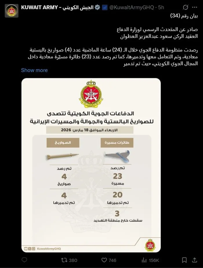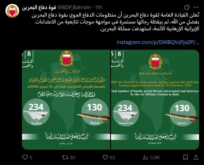 وخلال الأسبوعين الماضيين، تعرضت الكويت لهجوم بـ251 صاروخًا باليستيًا و472 طائرة مُسيّرة، والبحرين بـ132 صاروخًا و234 طائرة مسيّرة، وقطر بـ166 صاروخًا باليستيًا و75 طائرة مسيّرة وطائرتين مقاتلتين من طراز SU-24.