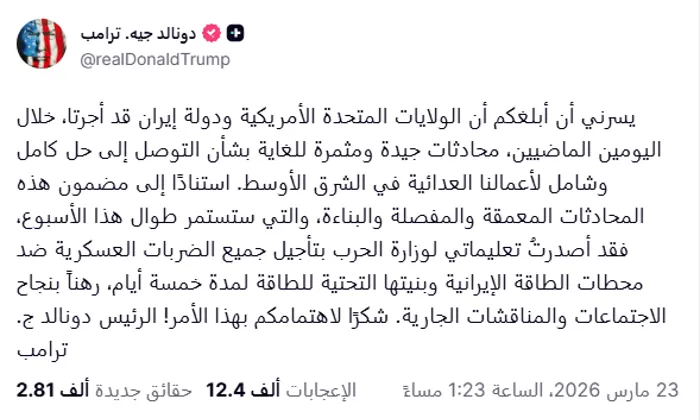 وعلى الصعيد الدبلوماسي، كتب ترامب في منشوره على TruthSocial: "أوعزت إلى وزارة الحرب بتأجيل جميع الضربات العسكرية ضد محطات الكهرباء الإيرانية والبنية التحتية للطاقة لمدة خمسة أيام، رهنًا بنجاح الاجتماعات والمناقشات الجارية التي ستتواصل طوال الأسبوع".