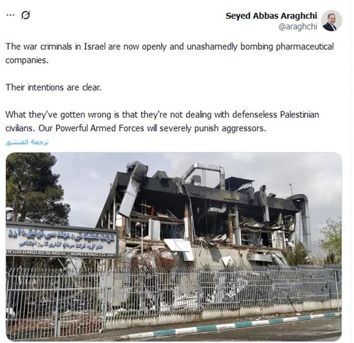 وأفاد "عراقجي" عبر تدوينة على منصة "إكس"، اليوم الثلاثاء، بأن قوات الاحتلال الإسرائيلي استهدفت منشآت لصناعة الأدوية، واصفًا منفذي الهجوم بـ"مجرمي حرب"، مُؤكدًا أن مخططاتهم باتت "مكشوفة تمامًا" للعيان.
