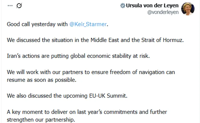 قالت رئيسة المفوضية الأوروبية، أورسولا فون دير لاين، اليوم الخميس، إنها بحثت مع رئيس الوزراء البريطاني كير ستارمر تطورات الأوضاع في الشرق الأوسط ومضيق هرمز، مؤكدة أن "تحركات إيران تضع الاستقرار الاقتصادي العالمي في خطر".